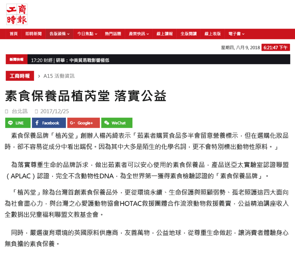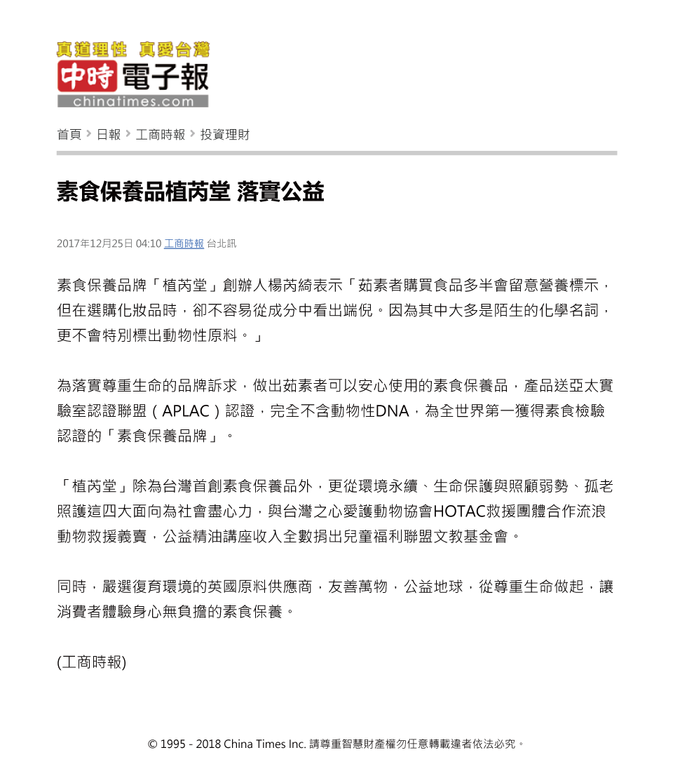 植芮堂 | 素食保養專賣 | 素食保養品植芮堂 落實公益 | 中國時報